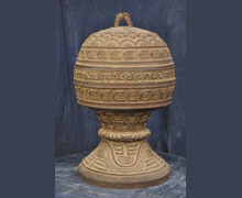 乾隆窃曲纹铜豆 清乾隆年制。器形完整,铜豆有盖,盖上作绞绳钮。器身饰以重环纹、窃曲纹。箍棱饰金钣纹,器底足部饰以垂鳞纹、环带纹。现存于孔庙和国子监博物馆。
